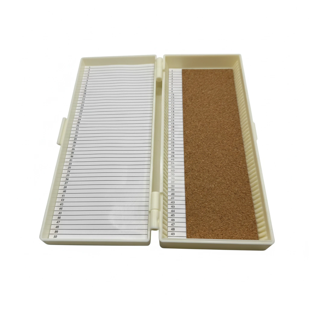 Archivo plástico con capacidad para 50 portaobjetos, utilizado para almacenar preparaciones microscópicas de forma segura y organizada.