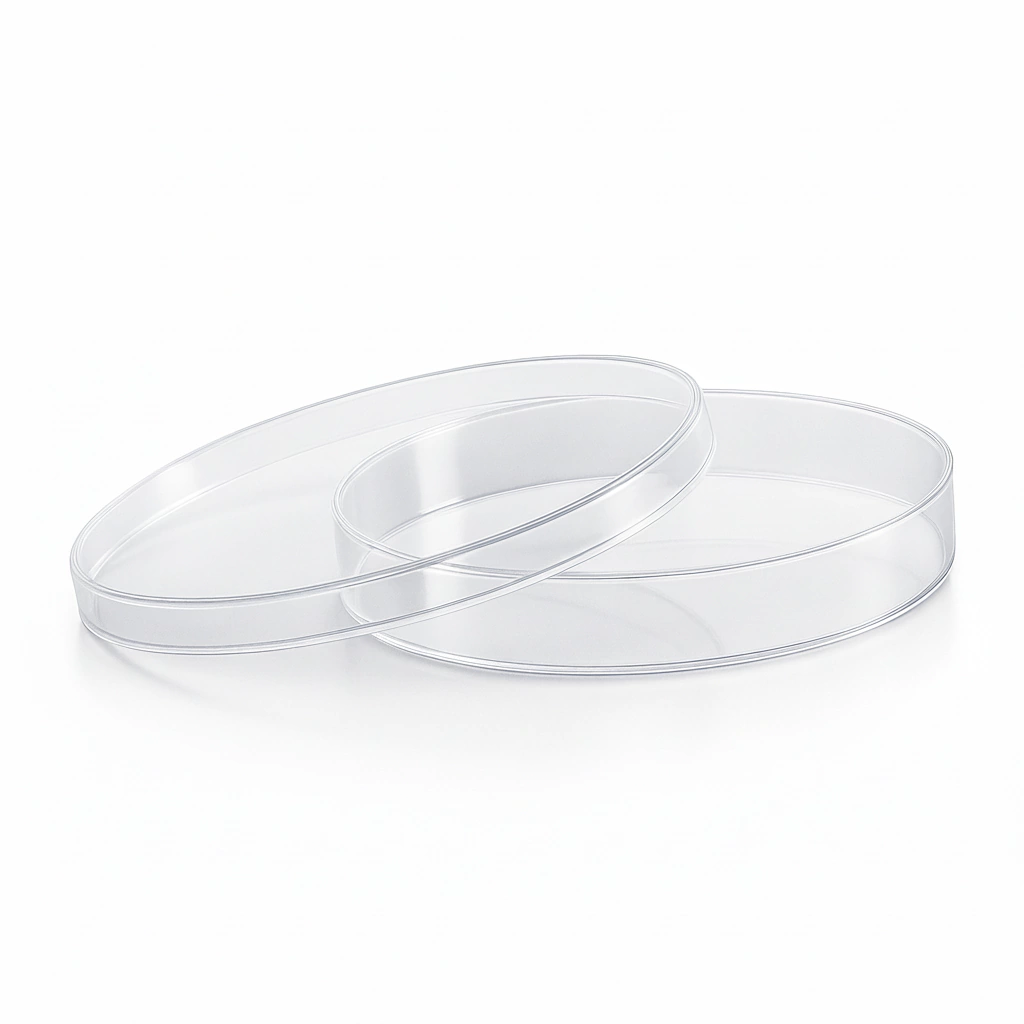 Placas de Petri estériles de 90 mm, fabricadas con poliestireno transparente de grado laboratorio, ampliamente utilizadas en microbiología y bacteriología.