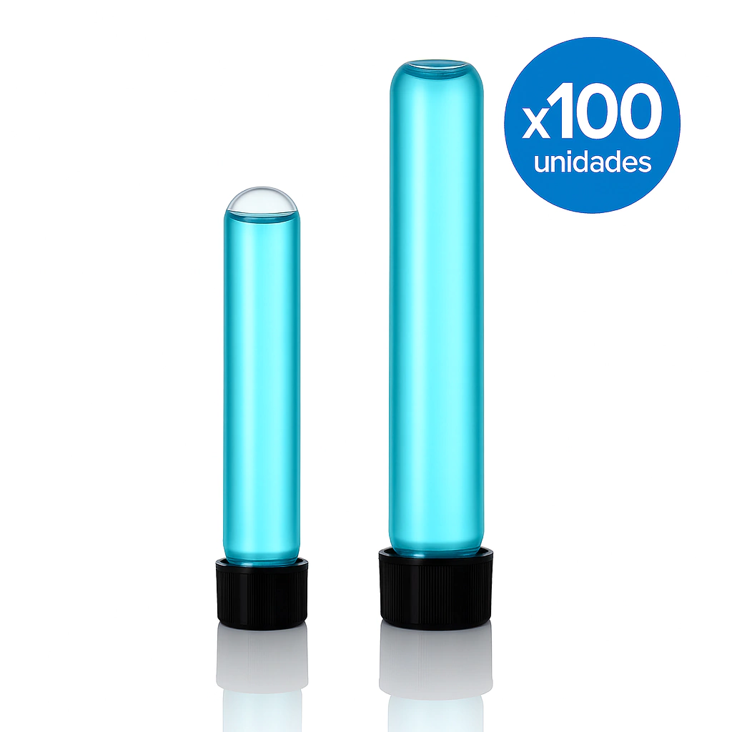 Tubos de vidrio borosilicato 3.3 de 16 × 100 mm con tapa a rosca bakelita, aptos para uso general de laboratorio.