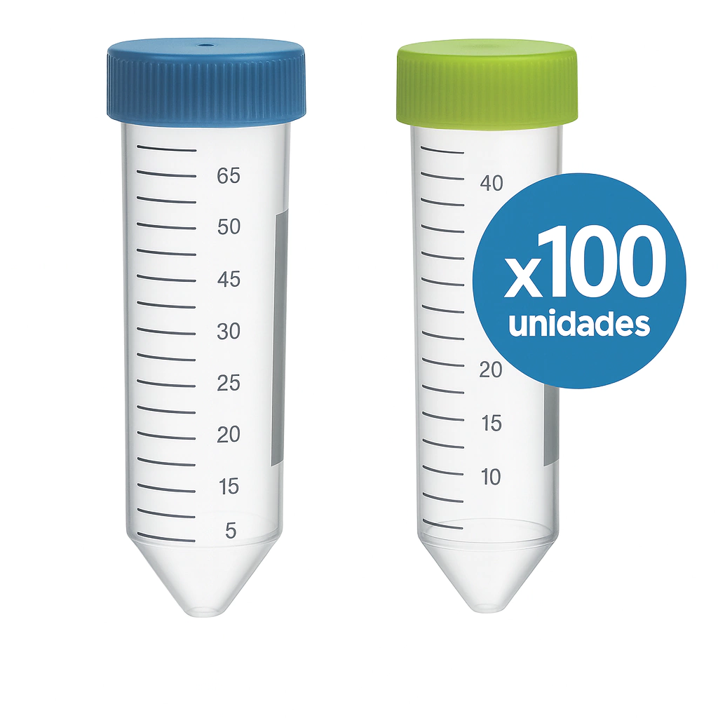 Tubo de centrifuga tipo Falcon de 50 mL, fabricado en polipropileno transparente (PP) grado laboratorio con tapa a rosca azul. Esterilizado individualmente y envasado en bolsa sellada. Presenta excelente resistencia química y mecánica y es apto para autoclave a 121 °C.